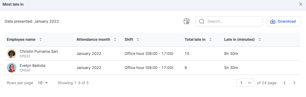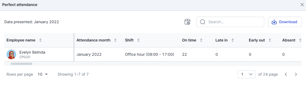 - Perfect attendance: Shows the total number of employees with perfect attendance. You can click the Perfect attendance number to see the name, and information about employees with perfect attendance and to "Download" the information as shown in the following image.