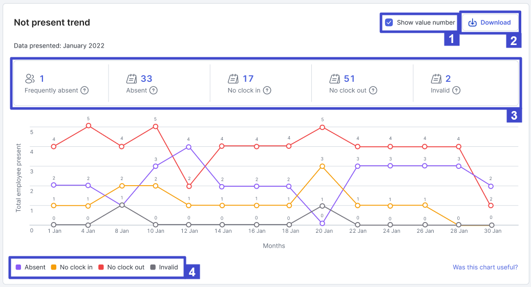 | 4 | Not present trend legend | You can view the diagram based on Absent, No clock in, No clock out, and Invalid information. |