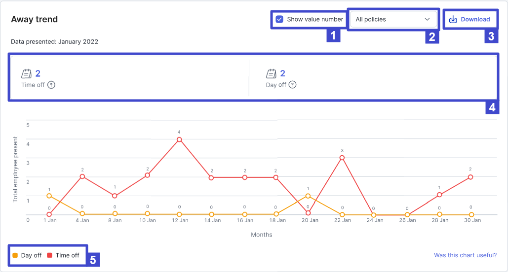 | 2 | Select policy | You can select a specific day off/time off policy according to the leave available in your company to be displayed on the graph. |