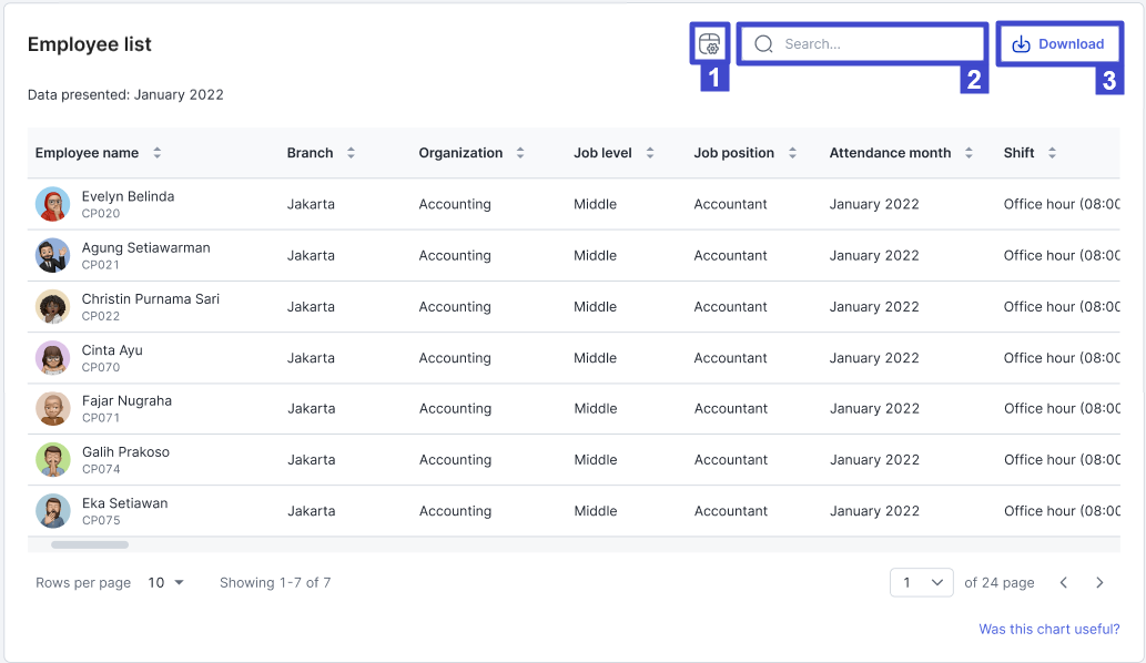 | 3 | Download | You can download the employee attendance list file in CSV by clicking this button.a |