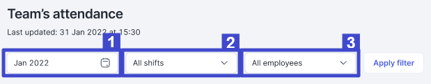 | 1 | Filter column | Click to filter the columns displayed in the employees table in a team. |