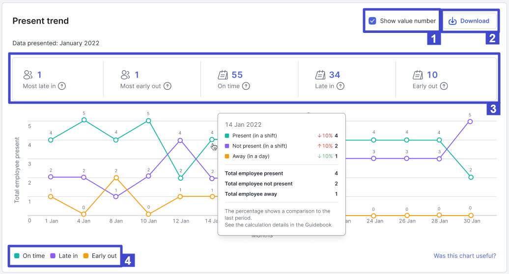 The present trend shows on-time, late-in, and early-out attendance. This data reflects the attendance pattern of employees who come to work. With this feature, you can monitor punctuality and absence so you can see attendance trends identify frequent late absences and so on. You can hover over the line graph to bring up detailed information.