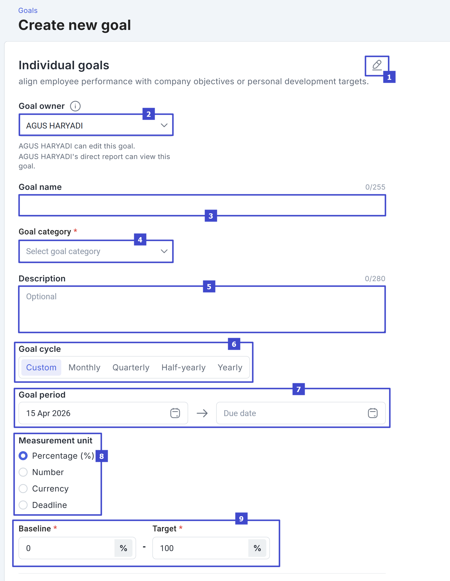 | 2 | Goal owner | Change or select the owner responsible for access to view, create, and edit goals. |