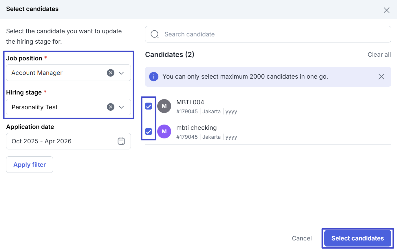 Check the names of candidates whose hiring stage you want to update. Then, click “Select candidates”.
