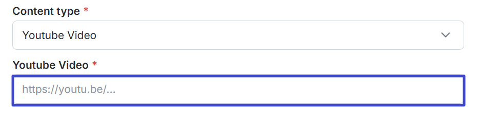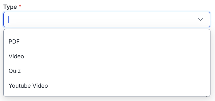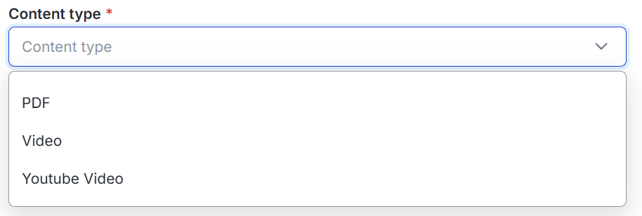 Choose one content type where options include Video, PDF, Quiz, and YouTube Video. If you choose: