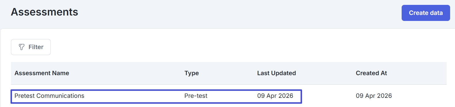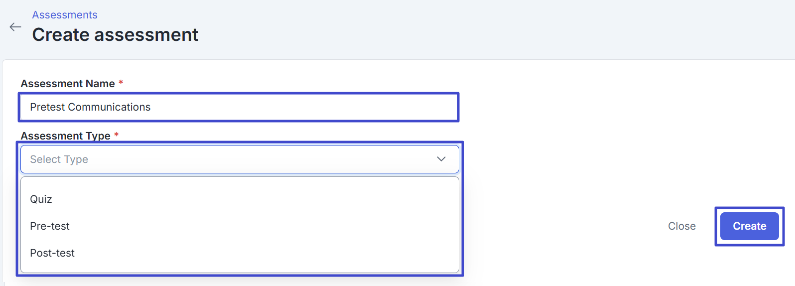 Enter the Assessment name and Assessment type. For example, the name of this evaluation method is Pre-test Business Meetings and Presentations and the type is Pre-test. Besides Pre-test, you can choose other options such as Quiz or Post-Test. Then, click “Create”.