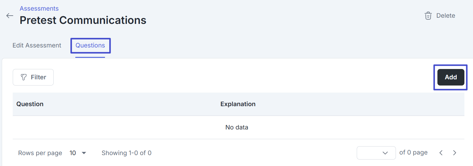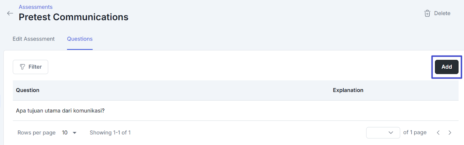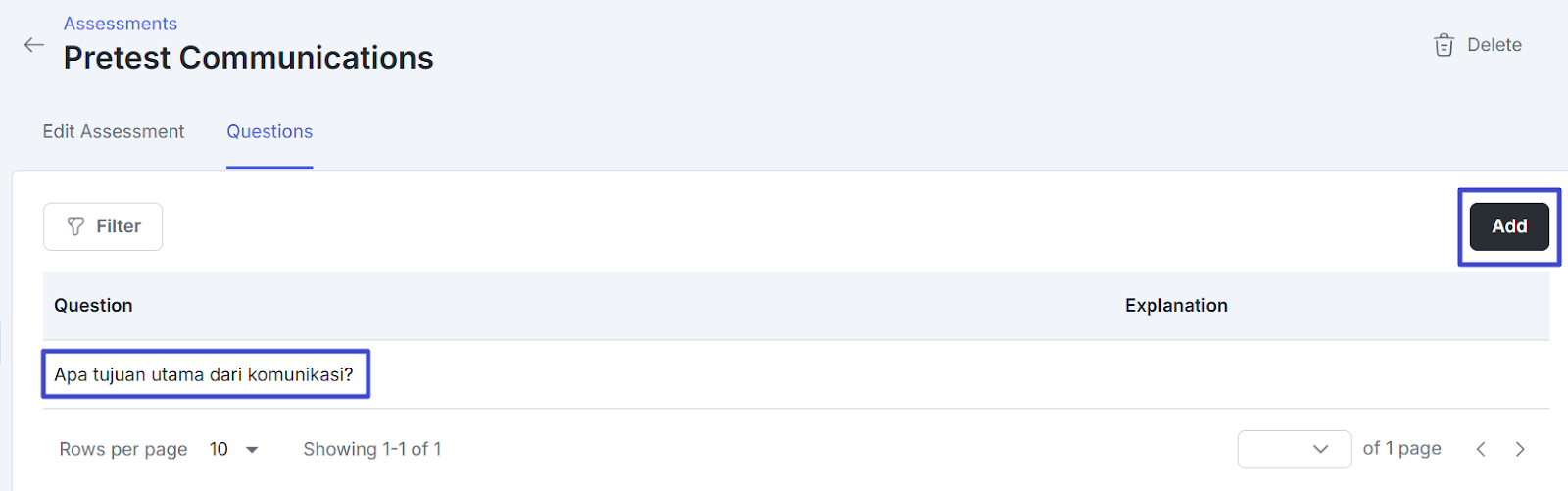 Each question created will appear on this page. You can add more questions by clicking “Add”.