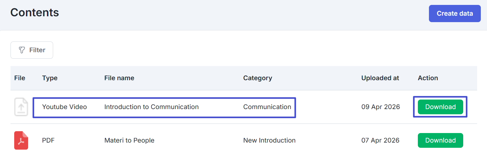 Each content that has been created and uploaded will be saved in the list on the Contents page. You can click “Download” to download the file or click the File name to open the content details sheet.