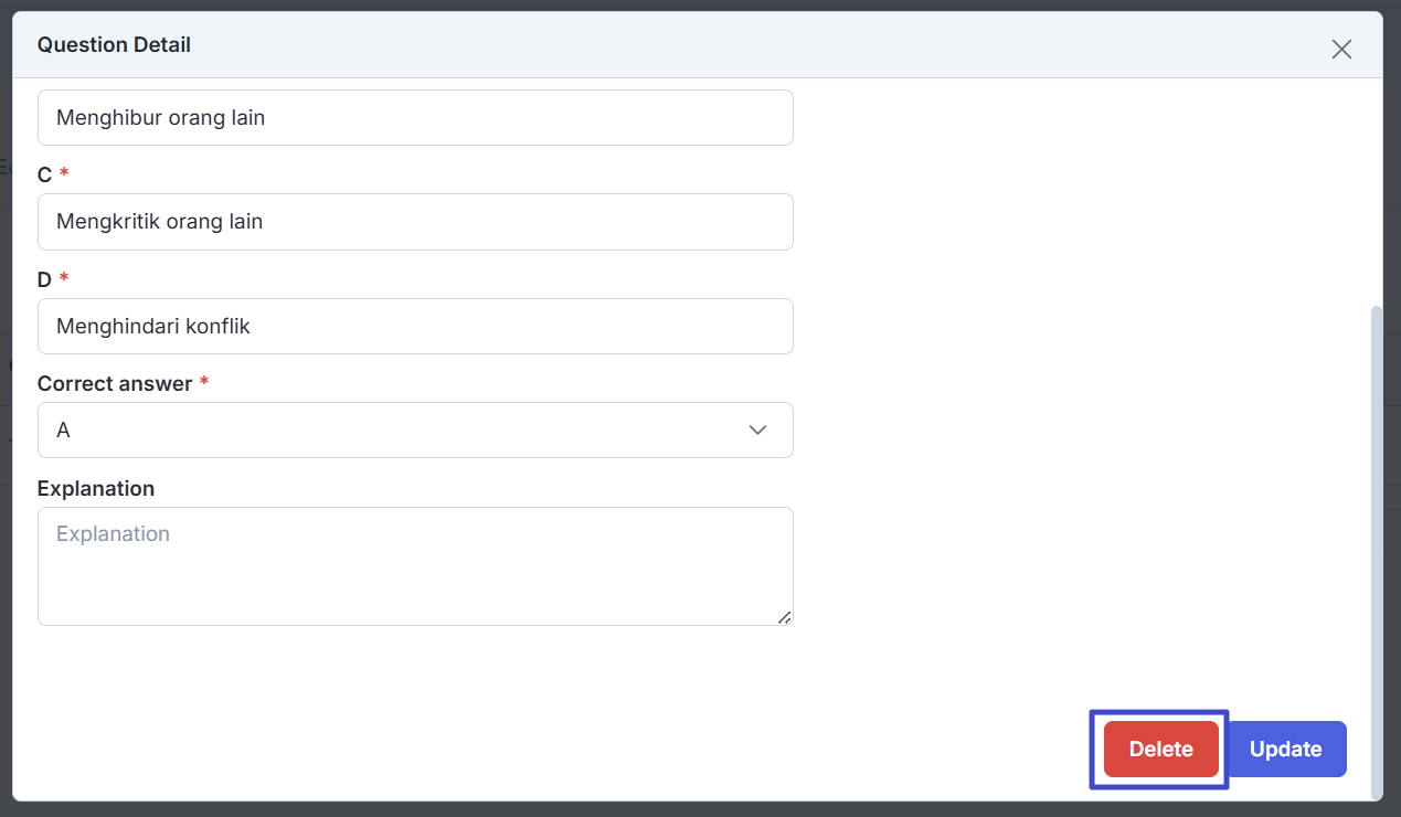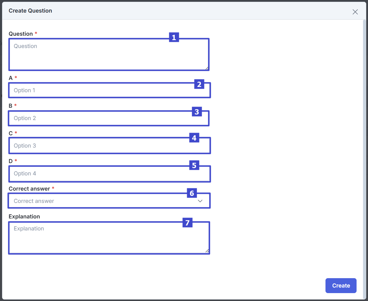 | 7 | Explanation | Enter an explanation or reason why the selected answer is correct. |