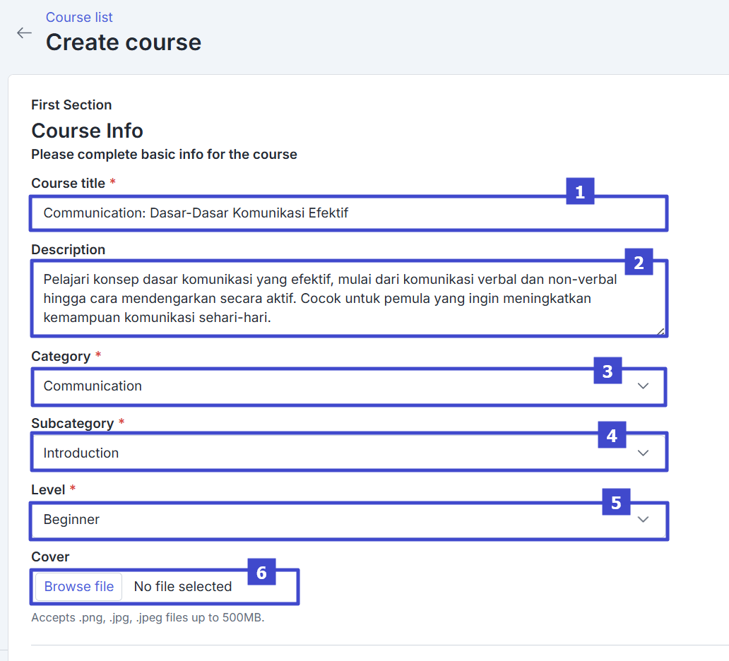 | 5 | Level | Select one level that best represents this course. The options available are levels you have created previously. |
