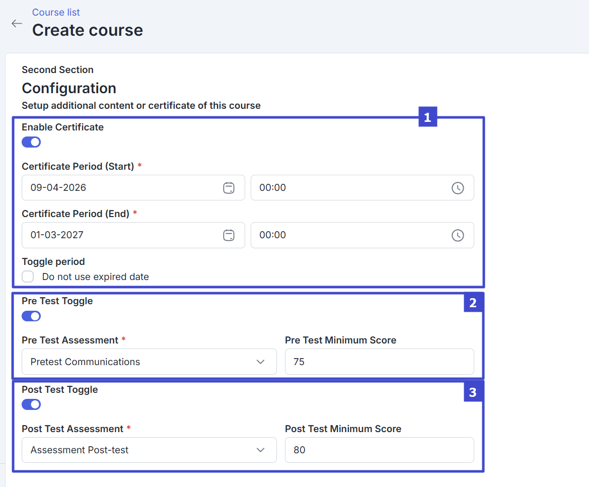 | 3 | Include a Post-test | Activate this toggle button to enable a post-test as a final evaluation of this course. Then, you can select the name of the post-test you have created previously in the Select assessment option. You can also set the minimum passing score in the Min. score (%) field. |