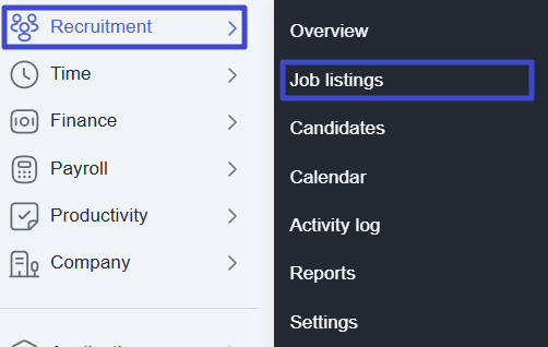 Then, select Recruitment, then go to the Job listings menu.
