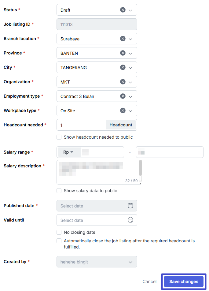 Once you have finished changing the information as needed, including the Status of this job listing to publish it by changing it to Published, click “Save changes”.