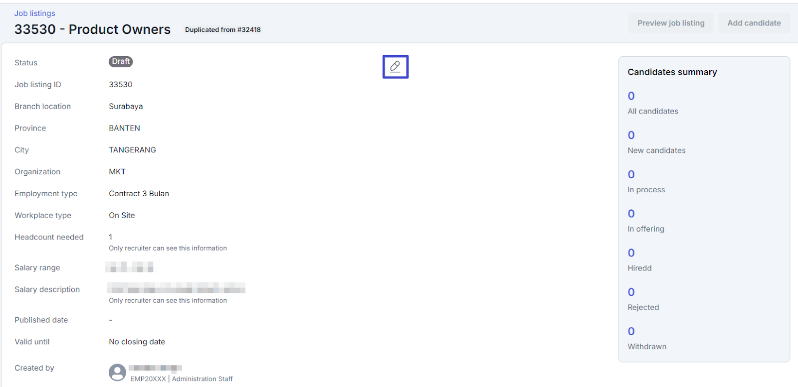 Click the “Pencil” icon to edit the job listing information that has been duplicated in draft and customize it.