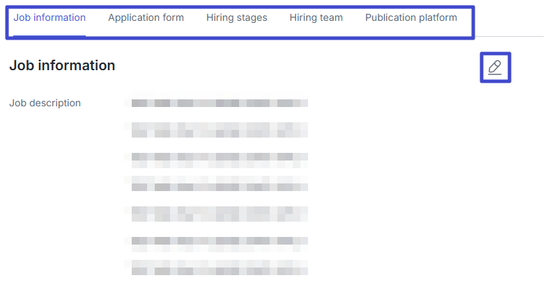 You can also change the data on the Job information, Application form, Hiring stages, Hiring team, and Publication platform tabs by clicking the “Pencil” icon.