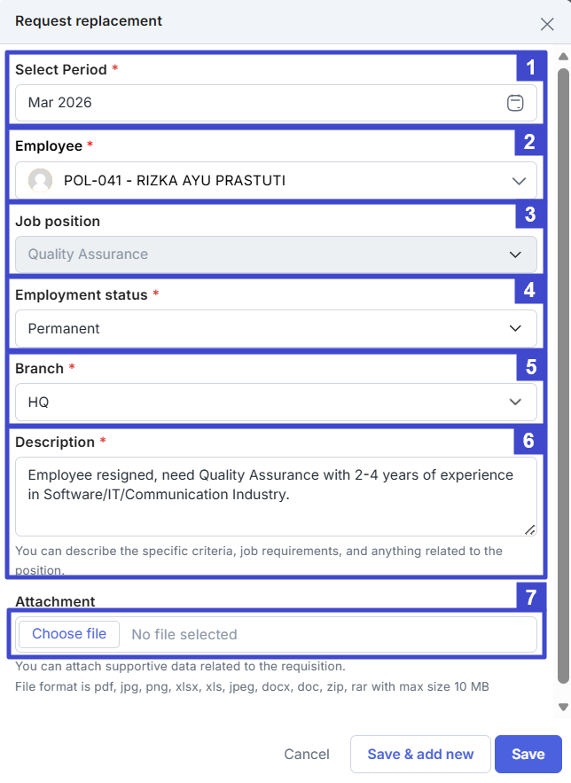 | 1 | Period | Select the period (month) when the replacement employee is needed to start working. |