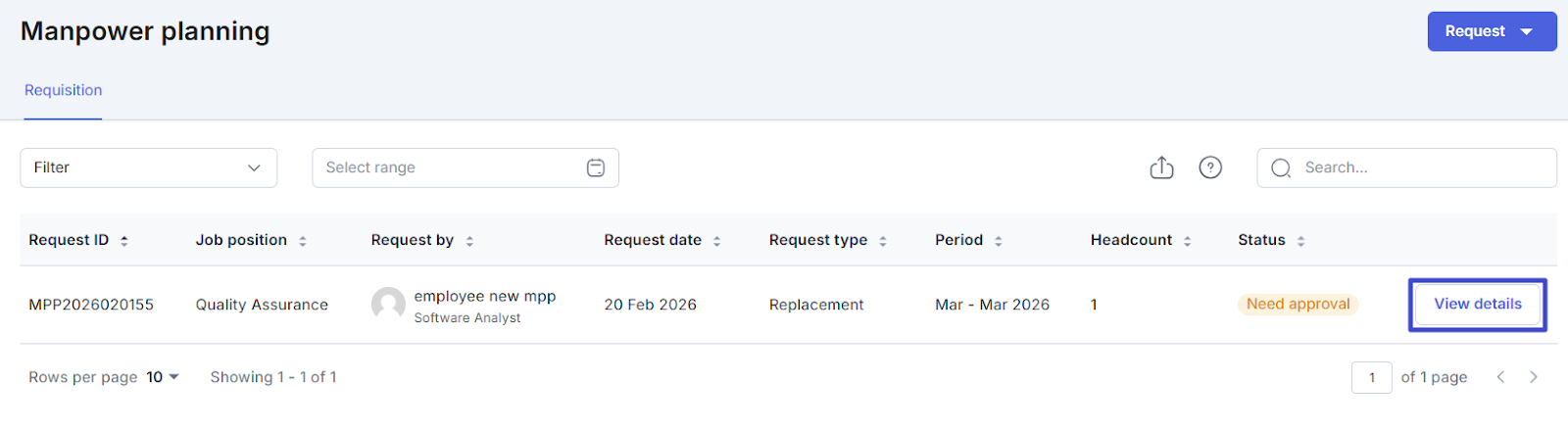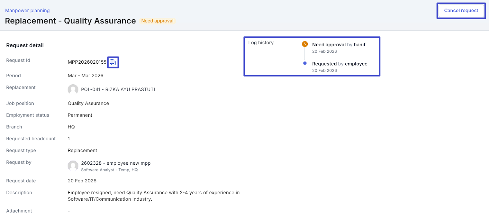 That is how to submit a replacement employee request with the access role Employee. Next, the submitted request can be approved or rejected by the Approver or Super Admin/Admin.