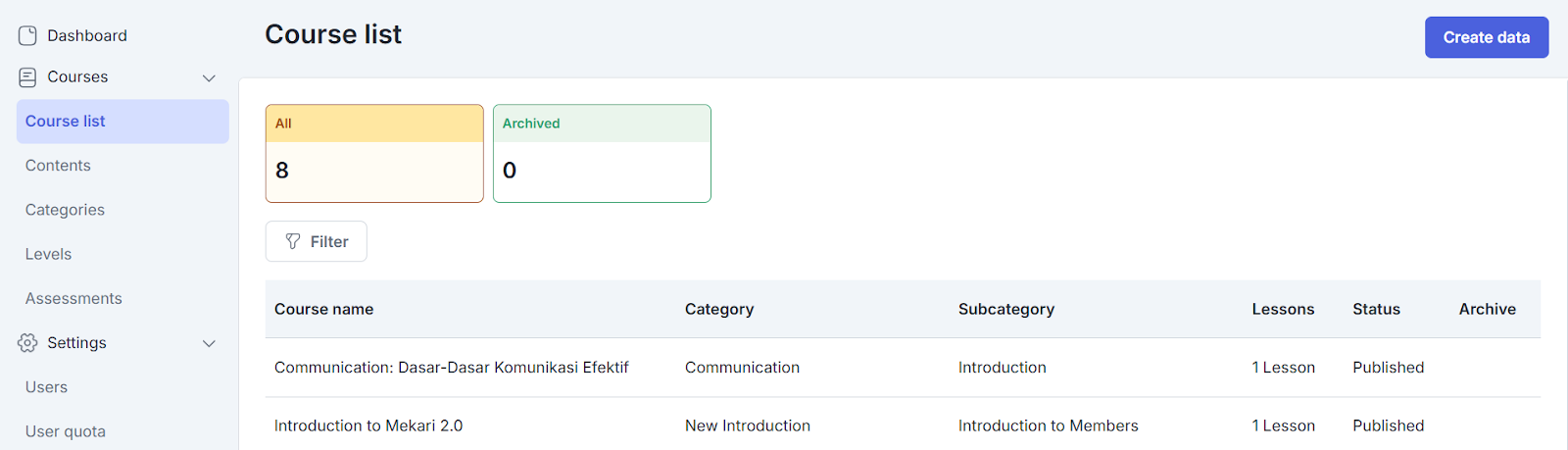 LMS Backyard is a special page used by administrators to manage all learning activities in Talenta LMS. Through LMS Backyard, administrators can create, organize, and publish courses, as well as manage all learning components such as categories, levels, content, and assessments.