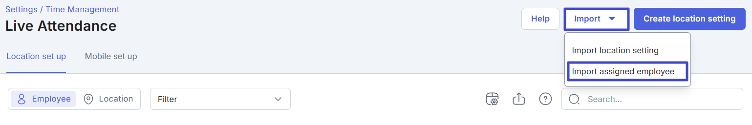 To add employee location settings in bulk, you can click the “Import” icon and then select Import assigned employee.