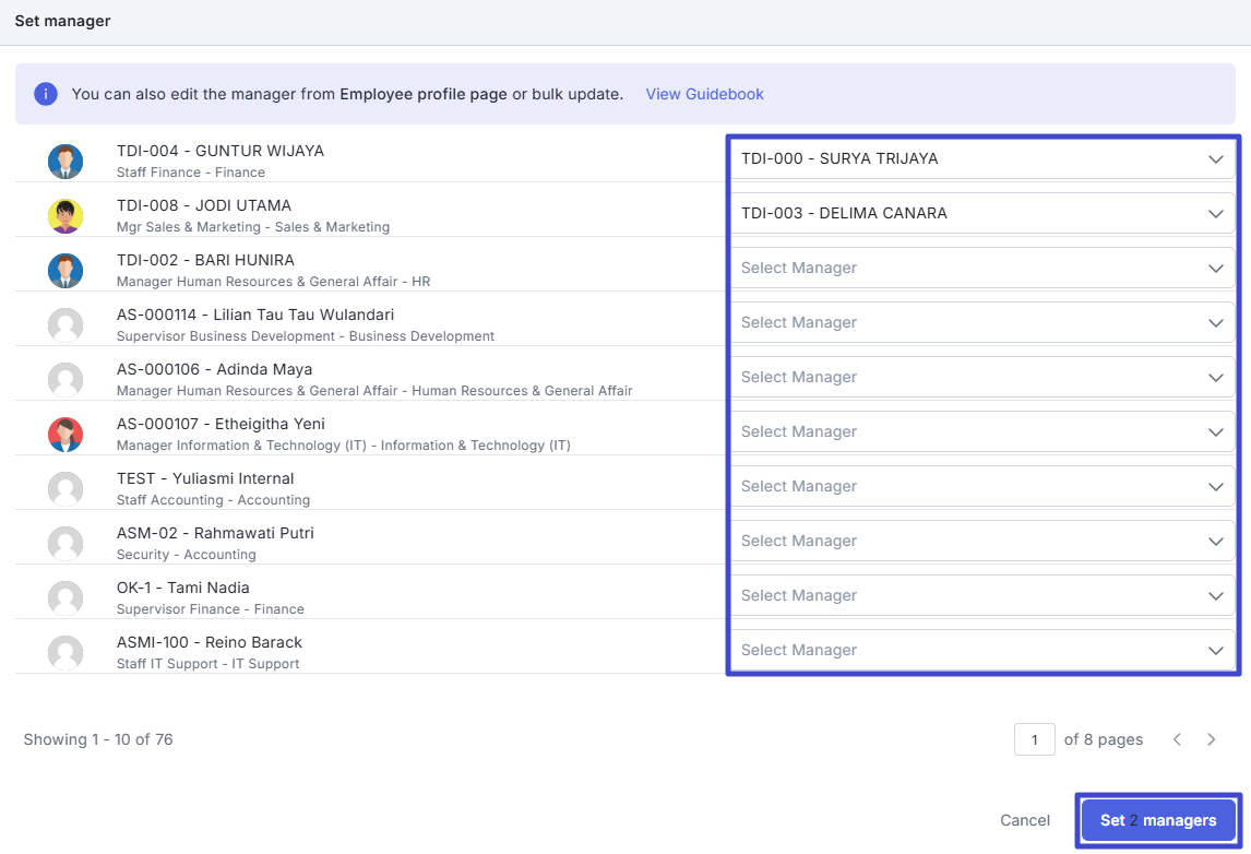 Click “Select manager” to choose a manager for each employee name in the pop-up that appears. Move from page to page by clicking “<” or “>”. When finished, click “Set [number] managers”.