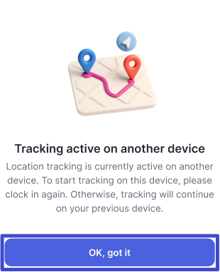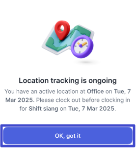 Pop-up ini muncul saat Anda melakukan Clock-in di perangkat lain (perangkat A, contoh: smartphone), padahal Anda memiliki log Clock-in dengan live tracking yang sedang berjalan di perangkat sebelumnya (perangkat B, contoh: tablet). Klik “OK, got it” dan disarankan untuk melakukan absensi di perangkat yang sama.