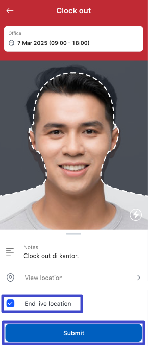 Pada saat Anda melakukan Clock-out dengan live tracking, Anda dapat mencentang “End live location” agar sistem berhenti memantau lokasi Anda. Namun, apabila Anda hendak menerapkan live tracking meskipun telah melakukan Clock-out, Anda dapat tidak mencentangnya. Kemudian, klik “Submit”. Selain di sini, Anda juga dapat mengakhiri live tracking melalui push notification.