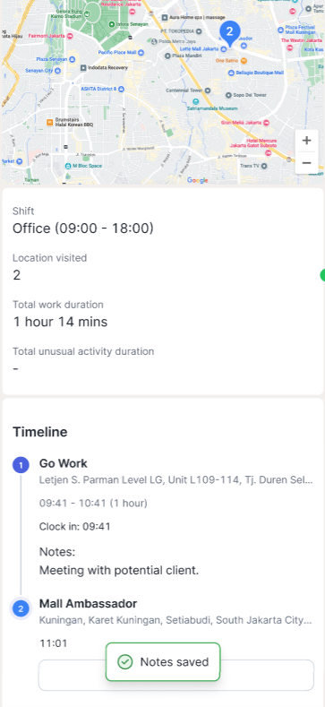 Anda dapat klik “panah ke samping” pada masing-masing riwayat untuk melihat rincian notes, foto, dan location ketika clock in dan clock out.