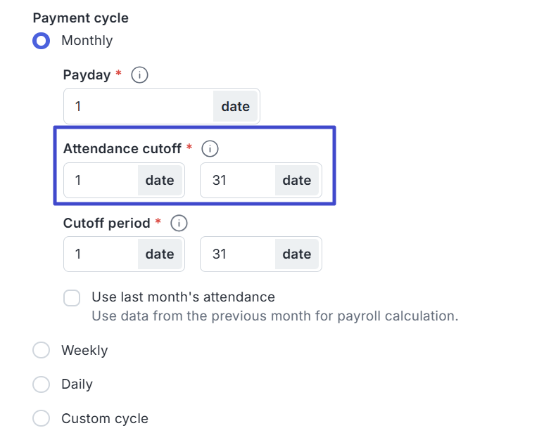 Lalu, isikan batasan tanggal absensi pada kolom Attendance cutoff, hal ini berkaitan dengan perhitungan komponen yang sifatnya daily (harian), misalnya: overtime, potongan keterlambatan, tunjangan makan siang.