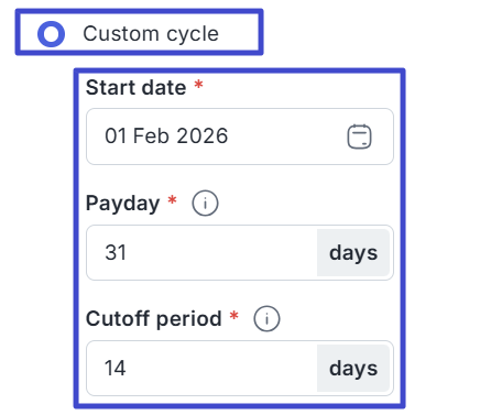 Sedangkan jika Anda memilih Custom cycle, pilih tanggal mulai jadwal pembayaran pada kolom Start Date, isi tanggal pembayaran penggajian dan Cutoff period.