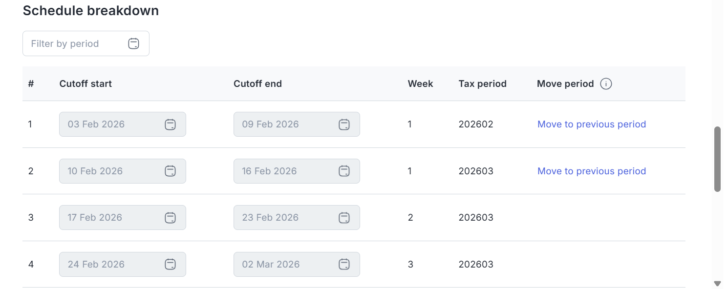 Pada payment schedule Anda dapat mengatur periode penggajian karyawan apabila perusahaan memiliki lebih dari satu kali periode penggajian dalam satu bulan. Pengaturan tersebut mengikuti konsep pengaturan Payroll Configuration. Sebelumnya, Anda dapat mempelajari cara mengelola pengaturan cut off, di sini.