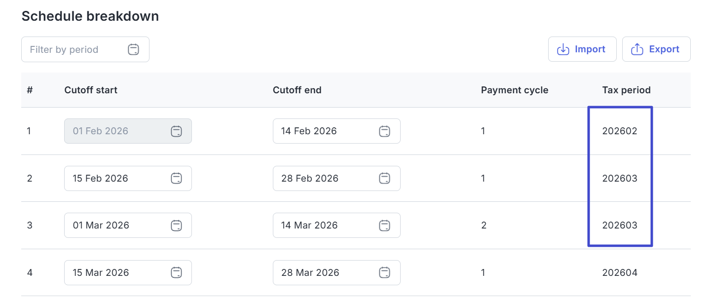 Sebagai catatan, payday akan berpengaruh kepada payroll period dan tax period. Anda dapat melihat simulasinya pada Schedule breakdown di bagian bawah.