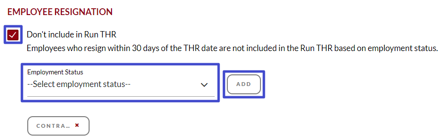 2. Berdasarkan Permenaker No. 6 Tahun 2016 Pasal 7 ayat (3), Pegawai PKWT tidak berhak menerima THR apabila tanggal pengunduran dirinya 0 (nol) hari kerja (30) hari sejak tanggal THR. Anda dapat mencentang Don’t include in Run THR apabila karyawan yang resign dalam kurun 30 hari THR tidak dihitung Run THR berdasarkan employment status yang Anda pilih di Select employment status > Add.