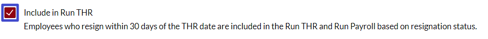 6. Centang Include in Run THR apabila karyawan yang mengundurkan diri  dalam kurun 30 hari THR dihitung Run THR dan Run Payroll berdasarkan status pengunduran diri.