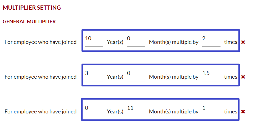 10. Selanjutnya, pada Multiplier Setting terdapat bagian pengaturan General. Pada bagian ini Anda dapat mengatur berapa kali gaji yang diterima karyawan saat THR pada bagian Multiplier setting. Sebagai contoh, karyawan yang bekerja 11 bulan bisa mendapatkan THR 1 kali gaji, 3 tahun 1.5 kali gaji dan 10 tahun 2 kali gaji.