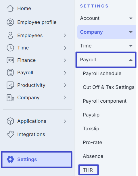 1. Pergi ke menu “Settings”. Klik Payroll lalu klik THR.