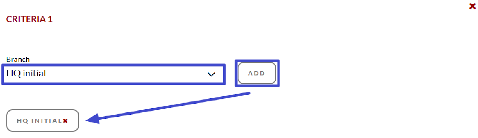 12. Kemudian, Anda dapat memilih cabang di kolom Branch, lalu klik “Add”. Setelah itu, maka nama Branch terpilih akan tercantum di bagian bawah seperti berikut.