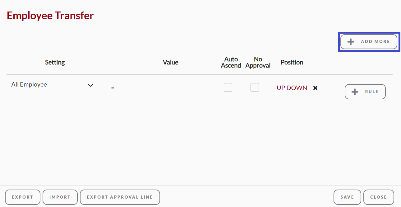 Secara default, pada fitur Employee Transfer tidak menggunakan sistem approval. Apabila Anda ingin dapat menggunakannya, Anda dapat mengaktifkannya terlebih dahulu pada menu setting, sehingga Anda dapat melakukan setting approval layer seperti request lainnya. Role yang dapat menggunakan fitur ini yaitu role sebagai super admin dan admin.