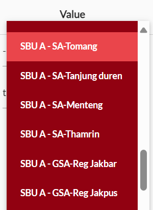 Maka, berdasarkan filter yang telah dipilih, Anda dapat memilih filter kategori Value untuk rincian spesifiknya. Contohnya, jika Anda memilih Filter SBU, maka yang muncul pada dropdown adalah nama-nama SBU pada perusahaan Anda. Namun, Anda tidak perlu memilih Value jika memilih filter setting All employee.