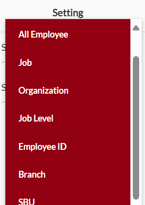 Kolom Setting berfungsi untuk memilih kepada siapa (subjek) setting approval ini akan berlaku. User dapat melakukan pengaturan dengan beberapa pilihan (all employee, job, organization, job level, employee ID, branch, dan SBU (Strategic Business Unit)).