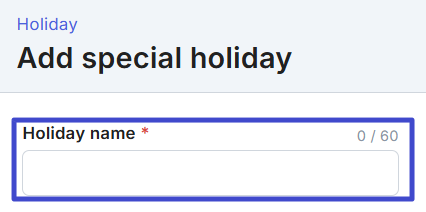 Anda akan diarahkan ke halaman berikut. Tambahkan nama hari libur pada kolom Holiday name dengan jumlah maksimal karakter 60.