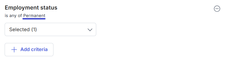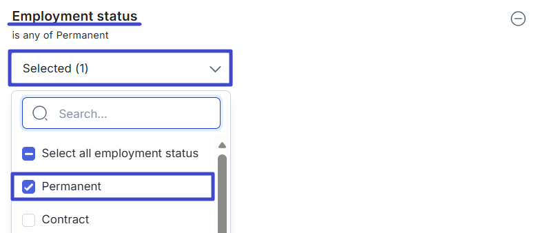 Sebagai contoh kasus, Anda ingin memberikan special holiday untuk karyawan dengan status pekerjaan penuh waktu untuk merayakan tahun baru. Maka, Anda dapat memilih kriteria Employment status, lalu centang checkbox Permanent.