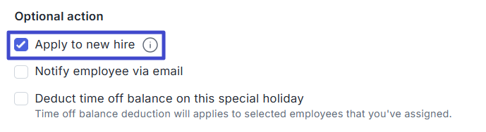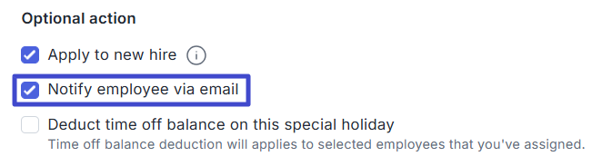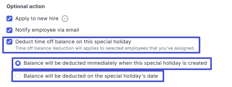 Centang checkbox “Deduct time off balance on this special holiday” apabila Anda ingin sistem secara otomatis mengurangi saldo cuti karyawan terpilih pada special holiday ini.