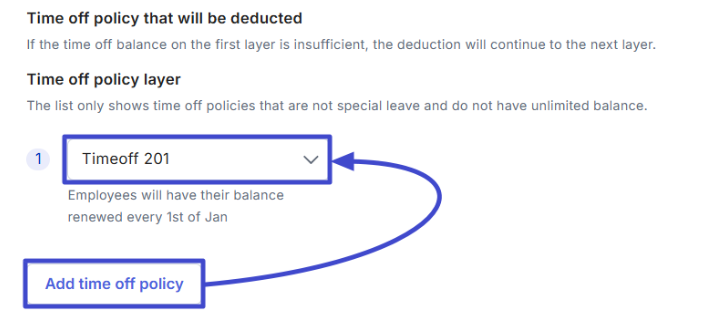 Selanjutnya, apabila Anda memilih opsi “Deduct time off balance on this special holiday”, maka akan muncul beberapa pengaturan tambahan seperti yang ditunjukkan pada gambar di bawah. Klik “Add time off policy” untuk memilih aturan cuti yang sebelumnya telah Anda buat di sistem Talenta.
