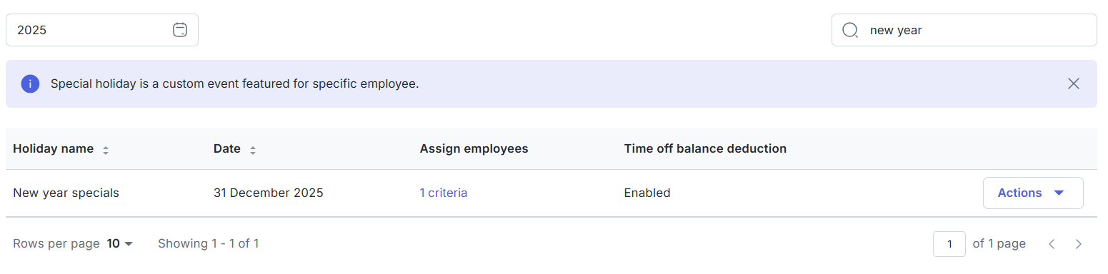 - Balance will be deducted on this special holiday’s date: Pilih opsi ini apabila Anda ingin sistem secara otomatis mengurangi saldo cuti pada saat tanggal special holiday. Semisal, pada panduan ini, diatur special holiday tanggal 31 Desember 2025, maka saldo karyawan berkurang pada tanggal tersebut.Penting