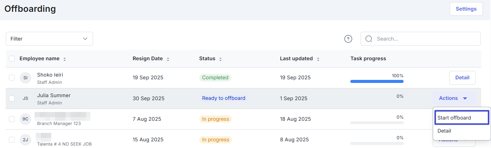 Opsi Start offboard hanya terdapat pada karyawan dengan status Ready to offboard. -