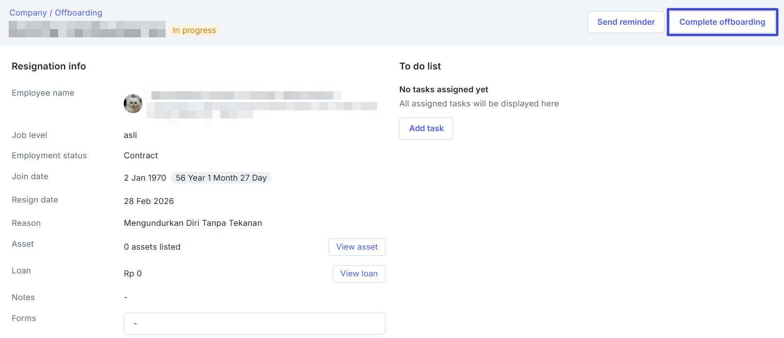 Maka, Anda akan diarahkan kembali ke halaman detail Offboarding. Hanya saja, status pada Offboarding berubah menjadi In progress, jika to do list Offboarding sudah lengkap dilakukan baik dari employee maupun PIC, dan Anda dapat klik “Complete offboarding” untuk menyelesaikan proses offboarding.