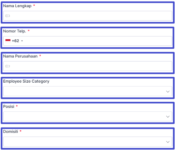 Lengkapi informasi berupa Nama Lengkap, Nomor Telp., Nama Perusahaan, Employee Size Category, Posisi, dan Domisili.