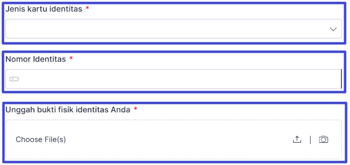 Lengkapi informasi berupa Jenis Kartu Identitas, Nomor Identitas, dan unggah bukti fisik identitas Anda (ukuran file maksimal 1 MB). Bila Anda adalah orang pribadi, gunakan KTP sebagai identitas Anda, dan bila Anda adalah perusahaan, pilihlah NPWP Badan.
