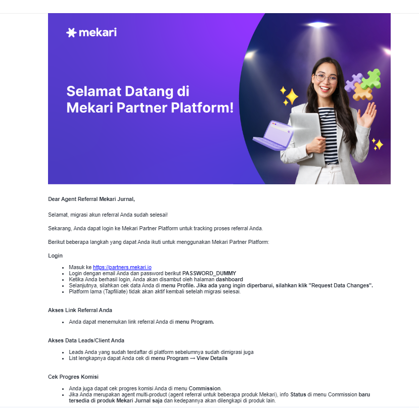 Ikuti langkah-langkah pada email tersebut dan login menggunakan email Anda dengan password sementara yang ada pada email (jika pertama kali sign in). Lalu, Anda akan masuk ke halaman utama (dashboard) Referral Mekari.