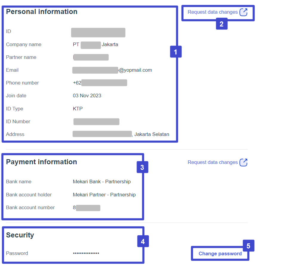 Menu Profile berisikan informasi berupa Personal data, Informasi pembayaran, dan perubahan kata sandi pada akun Anda. Berikut tampilan sekilas menu Profile pada Mekari Partner Platform.